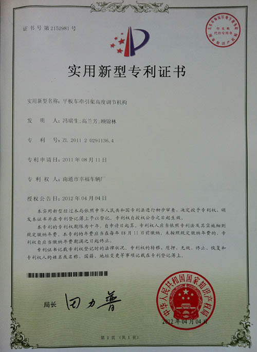 平板車牽引架高度調(diào)節(jié)機(jī)構(gòu)專利證書(shū)